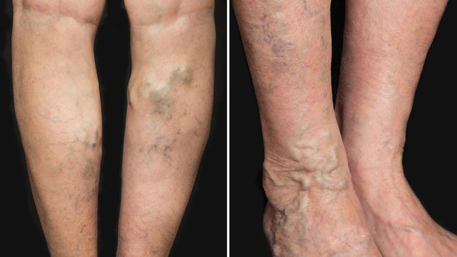 Obrázek výše ukazuje zdravou žílu na levé straně, kterou si můžete porovnat s křečovými žilami zprava.